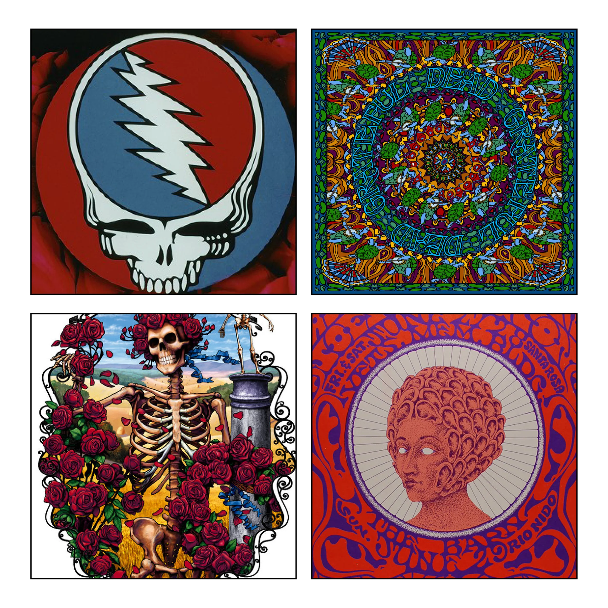 Grateful Dead imagery includes roses, skull and skeleton imagery, radial symmetry, bright colors, psychedelic lettering, and of course, the iconic "Steal Your Face" logo.