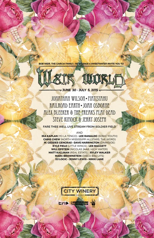 Weir World was a six-day live music series at City Winery Chicago before and during the Grateful Dead 50th Anniversary shows at Soldier Field in Chicago. The project was daunting--a commemorative poster needs to be informative, pretty, and indicative of its time and place. The psychedelic imagery of the Grateful Dead and the '60s has spawned so many visual clichés that I wanted to avoid making yet another one, but still reference the era visually.